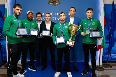 Министърът на младежта и спорта Иван Пешев награди с почетни плакети медалистите от Европейското първенство по бокс до 23 години в Будапеща. Българските състезатели спечелиха три медала и заеха третото място в крайното класиране по отличия в мъжката надпревара. С европейската титла в категория до 60 кг триумфира Радослав Росенов, а Викторио Илиев (65 кг) […]